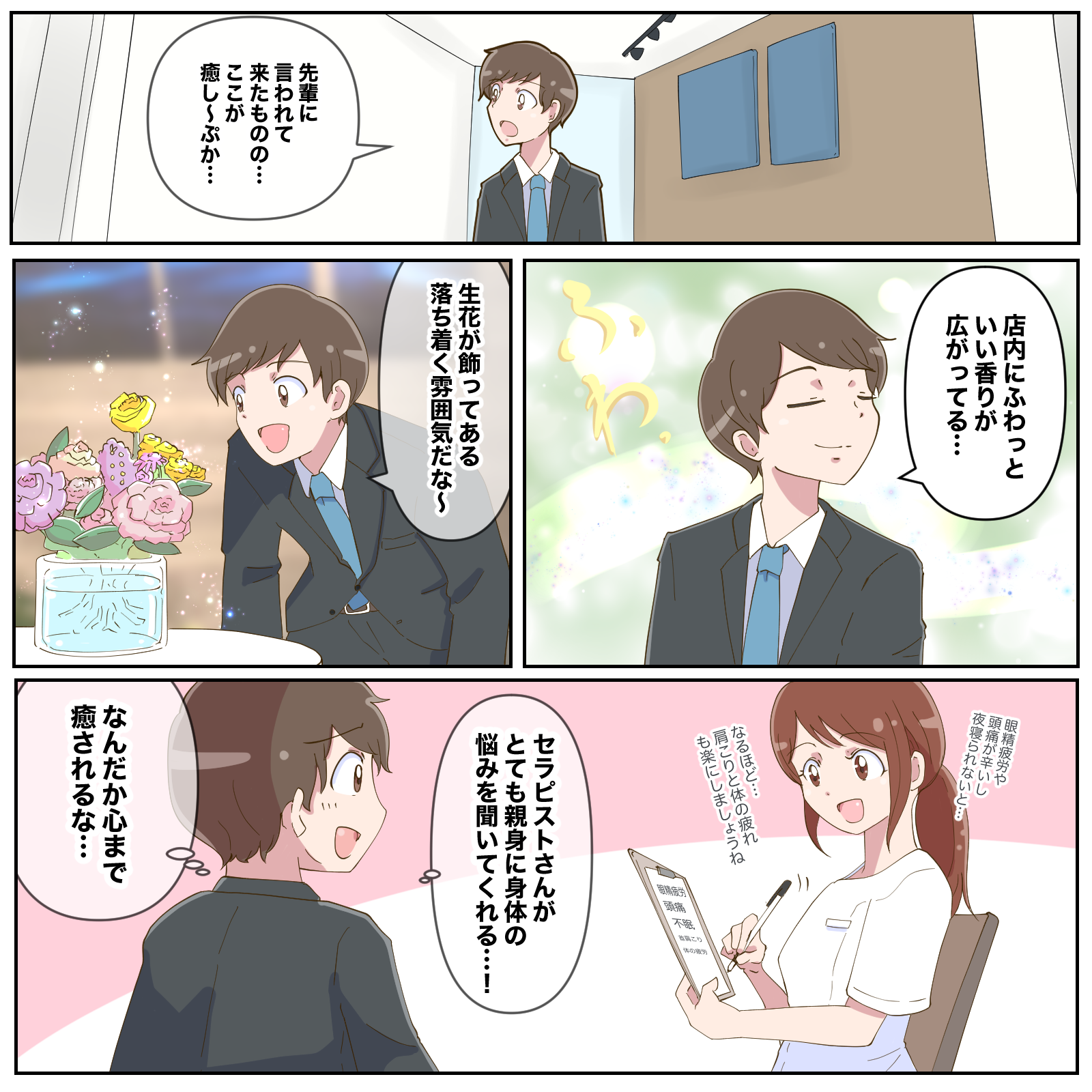 カウンセリングでは私の疲れや不調に合わせて施術をご提案していただきました。仕事で長くパソコンを使うので目の疲れが常にありましたが、施術後には目の疲れが取れ、体も軽くなった気がします。接客もとても丁寧でリラックスできる雰囲気でした。
